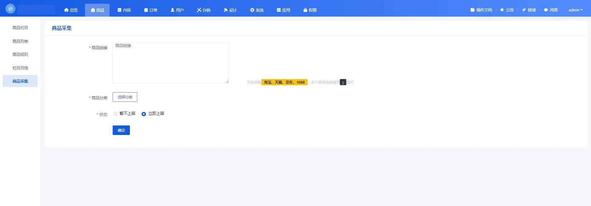2、采集商品:复制商品链接填写在后台输入框内,选择商品即将要添加到的商品栏目,采集商品;