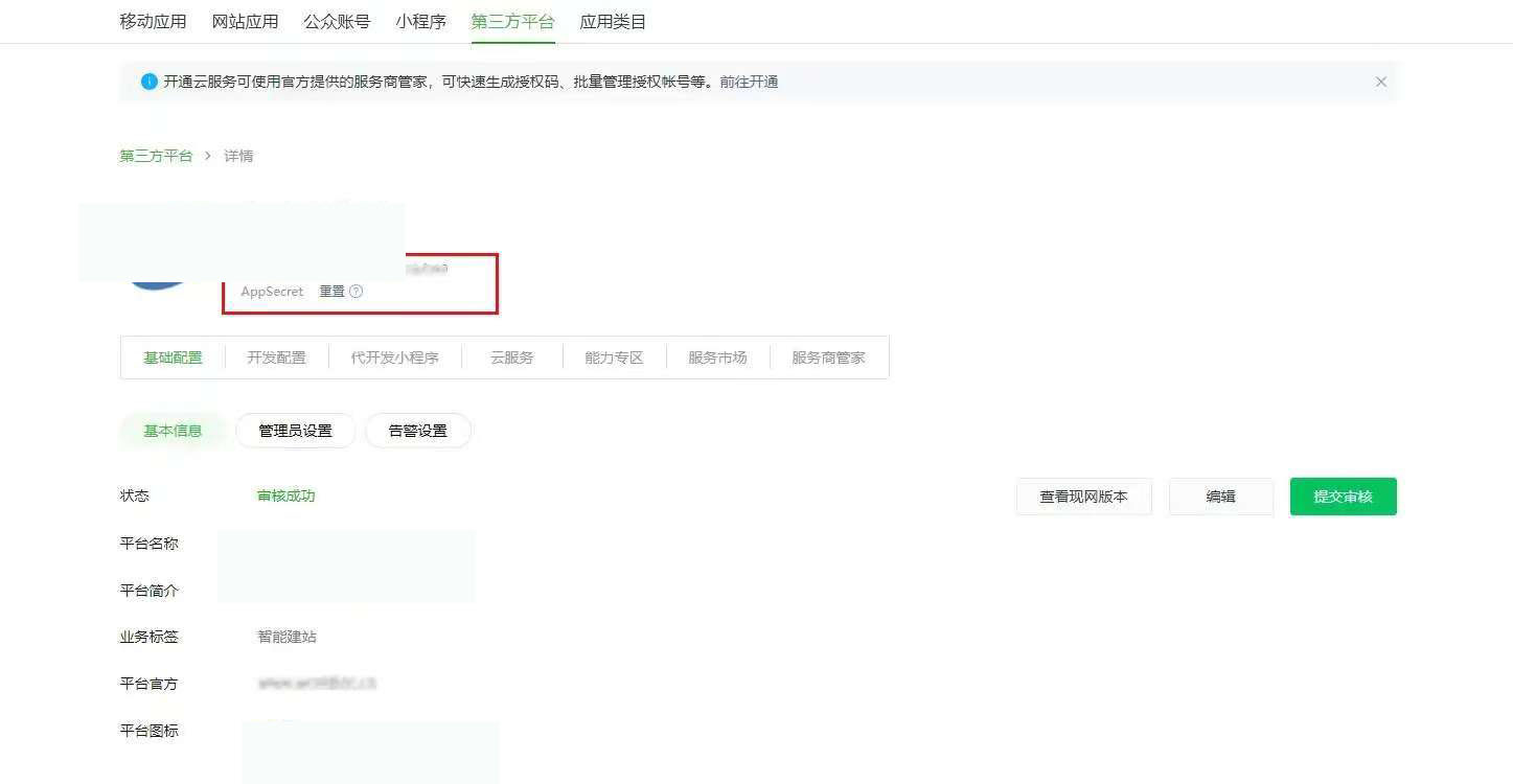 消息与事件接收:复制后台(平台菜单:系统-第三方平台)对应信息填写到第三方平台,确保两边一致