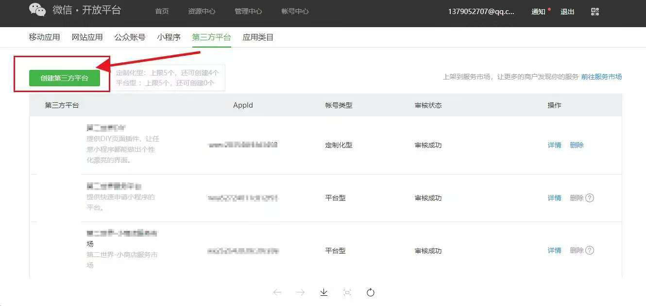 (1)点击创建第三方平台,注意平台型服务商创建上限为5个