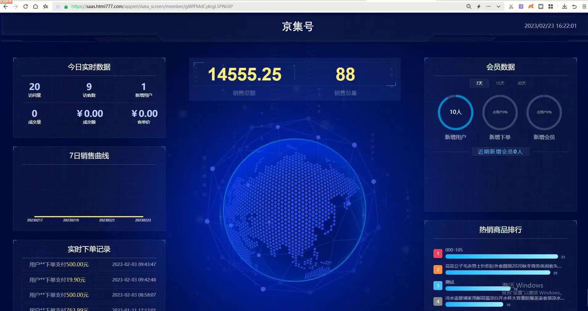 数据大屏插件,可视化大屏报表,整合今日销售数据、商品销售排行、近期用户转化率等不同来源数据,实现数据大屏动态展示